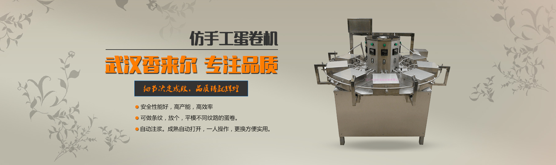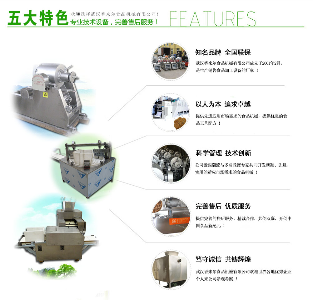 武漢香來(lái)爾食品機(jī)械有限公司成立于2001年2月,是生產(chǎn)銷(xiāo)售休閑食品加工設(shè)備的廠家。公司緊跟市場(chǎng)潮流與華工、華農(nóng)多名共同開(kāi)發(fā)新穎、實(shí)用的適應(yīng)市場(chǎng)需求的食品機(jī)械,自有車(chē)、刨、鉆、銑、剪板、折彎等先l進(jìn)機(jī)床100多臺(tái) 套。7年誠(chéng)信通會(huì)員,產(chǎn)品出口拉美、非洲、東南亞、歐洲等很多國(guó)家和地區(qū),國(guó)內(nèi)很多食品企業(yè)都是我們的合作伙伴。目前公司專(zhuān)門(mén)設(shè)立一個(gè)的售后 服務(wù)班子,在公司逐步發(fā)展強(qiáng)大的過(guò)程中,一直堅(jiān)持售后服務(wù)的同步發(fā)展,精良的食品設(shè)...